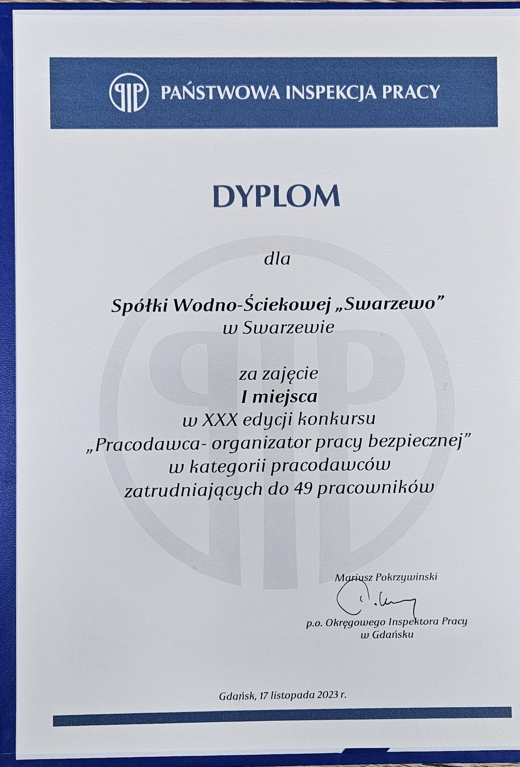W Październiku 2023 r. Spółka Wodno-Ściekowa Swarzewo ponownie zdobyła I-sze miejsce w „Pracodawca – organizator pracy bezpiecznej” organizowanym przez Państwową Inspekcję Pracy. Kapituła Państwowej Inspekcji pracy ponownie potwierdziła bardzo dobre warunki pracy w Spółce Wodno-Ściekowej Swarzewo, związane z bezpieczeństwem pracowników oraz doceniła wkład, jaki przywiązuje się w SWS Swarzewo w ochronę życia ludzkiego.
