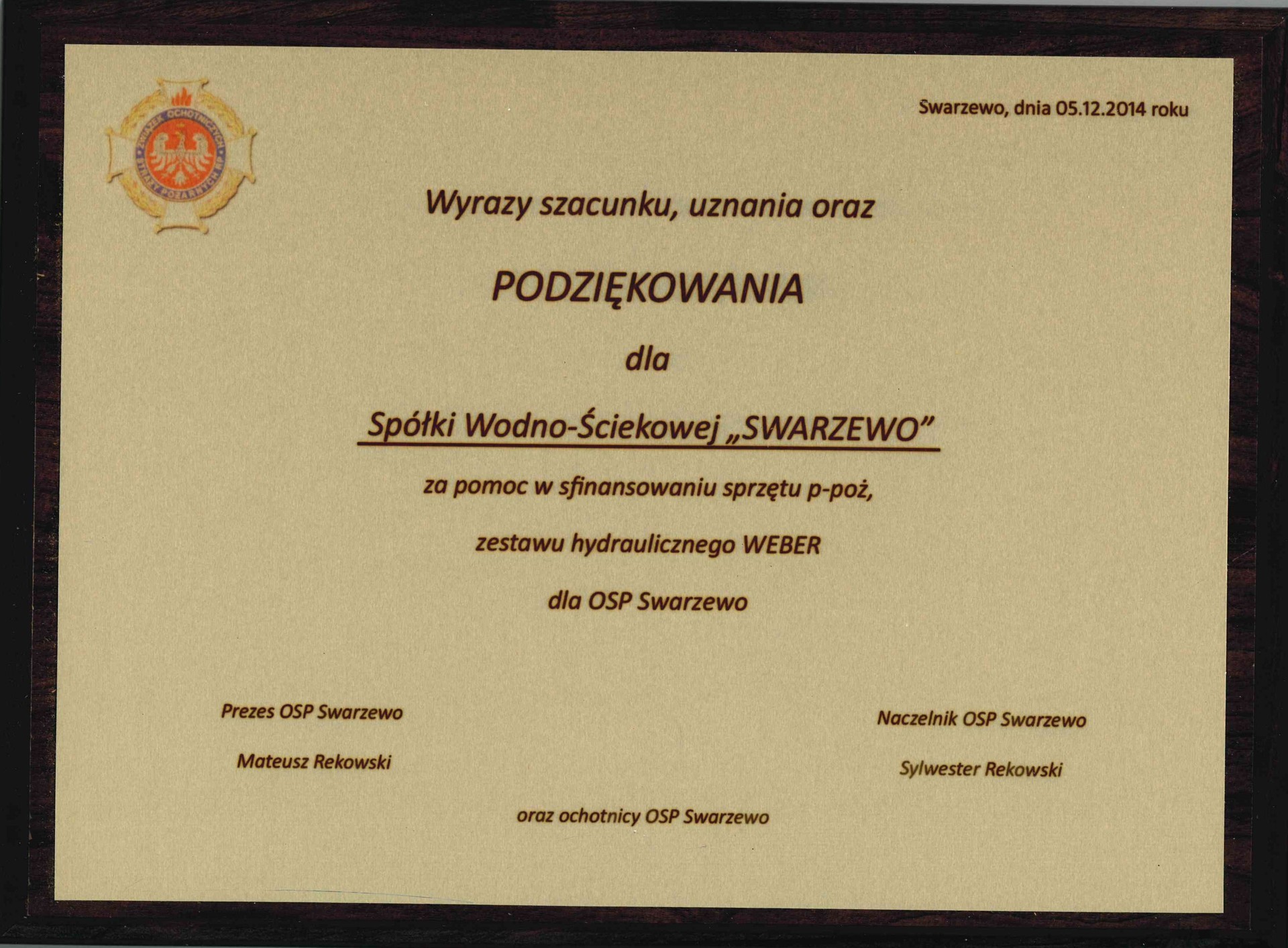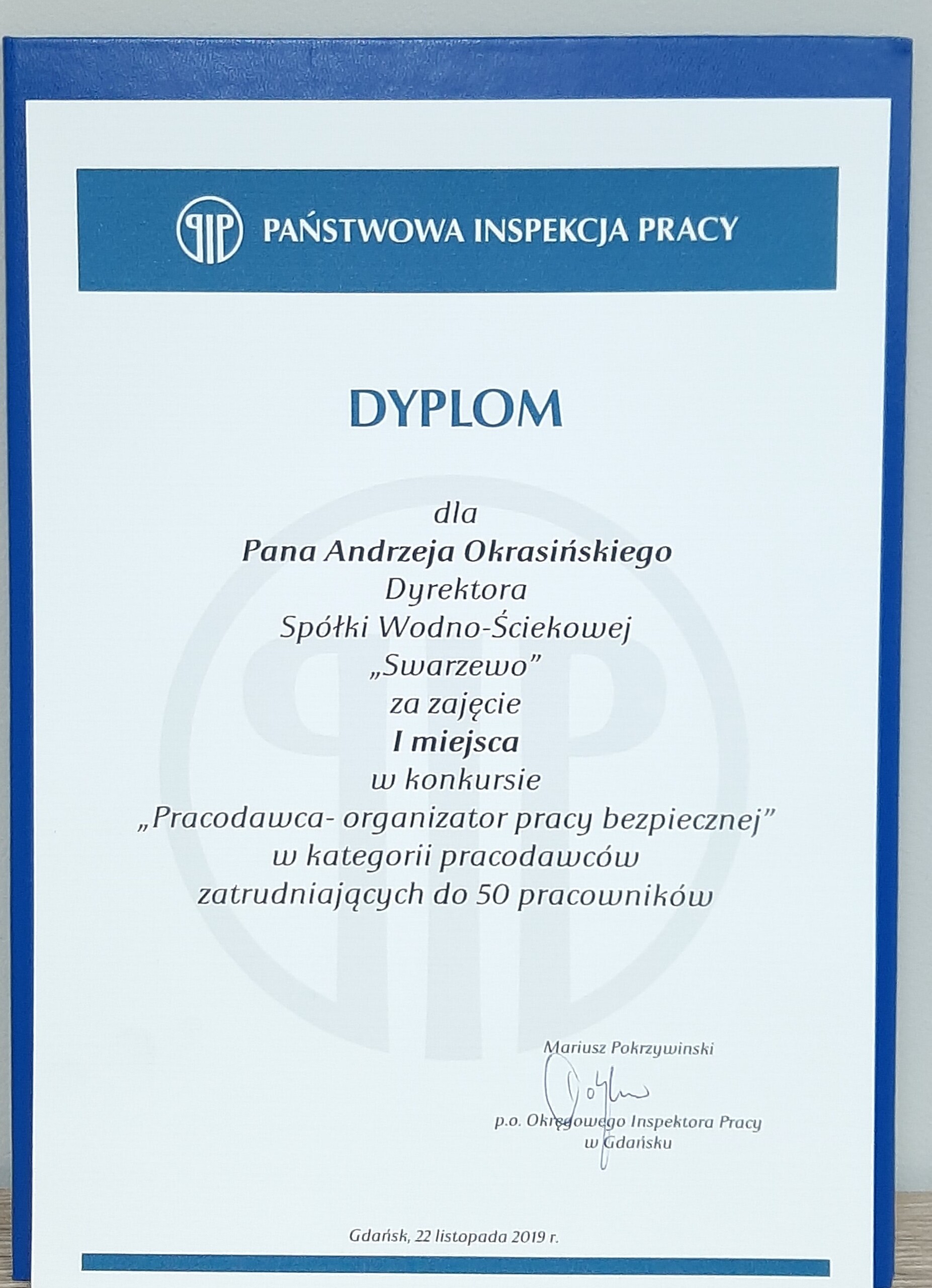 W listopadzie 2019 r. Spółka Wodno-Ściekowa Swarzewo zdobyła I-sze miejsce w Polsce oraz w województwie Pomorskim w konkursie „Pracodawca – organizator pracy bezpiecznej” organizowanym przez Państwową Inspekcję Pracy. Konkursie, którego celem jest zaszczepienie wśród przedsiębiorców ducha rywalizacji nieco innej, niż wymaga od nich typowa, codzienna, ekonomiczna gra rynkowa. Konkursie, który dzisiaj jest nie tylko szansą zdobycia nagrody, ale przede wszystkim stanowi motywację dla dalszego rozwoju każdej firmy, także w kierunku stałego monitorowania i poprawy warunków pracy oraz ochrony życia ludzkiego.
